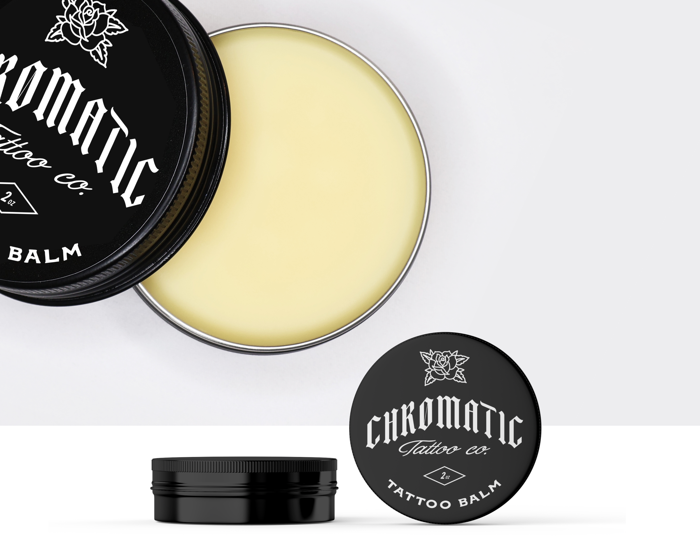 Tattoo Balm by Chromatic Tattoo Co. is a vegan, all-natural product designed to provide exceptional care for both new and existing tattoos. Our Tattoo Balm is formulated to enhance color vibrancy and definition, providing your tattoos with a renewed and refreshed look. See the results after one use.